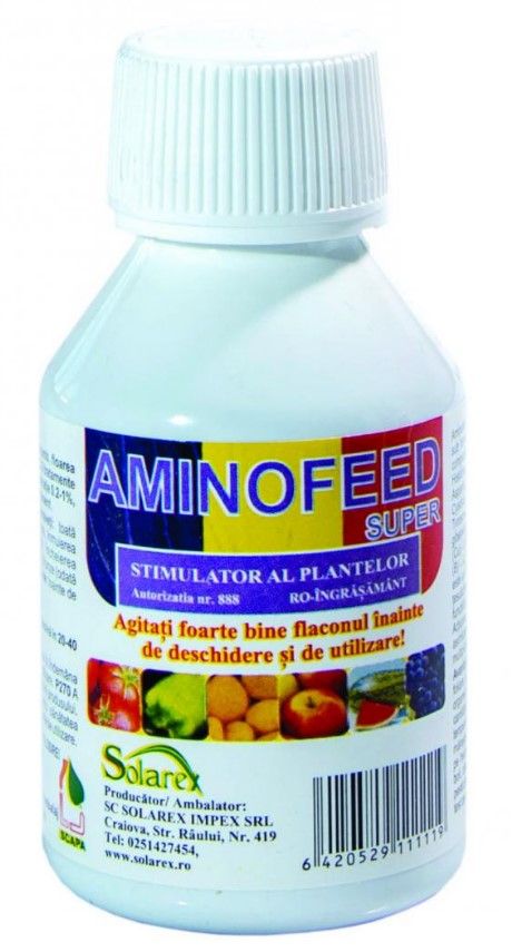Caracteristici generale: Aminofeed Super - este un stimulent de creştere, produs sub formă de gel, cu conţinut scăzut de azot. Are în compoziţia sa chimică azot ( 60 gr/l), aminoacizi: (Lysine, Histidine, Arginine, Hydroxyproline, Threonine, Acid Aspartic, Serine, Proline, Acid Glutamic, Glycine, Alanine, Cystine, Valine, Methionine, Isoleucine, Leucine, Tyrosine, Phenylalanine, Tryptophan), alge marine, gibereline, microelemente: Mangan (Mn) – 0.05 g/l, Cupru (Cu) – 0.025 g/l, Fier (Fe) – 0.2 g/l, Zinc (Zn) – 0.05 g/l, Bor (B) – 0.07 g/l. Datorită aminoacizilor, Aminofeed Super este un foarte bun activator al proceselor biochimice din ţesuturile plantelor având o influenţă directă asupra funcţiilor vitale ale celulelor, reglându-le activitatea. Acţiunea directă a produsului se observă în creşterea asimilaţiei minerale, a conţinutului de clorofilă şi a multiplicării celulare.