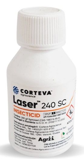 Insecticidul de contact LASER 240 SC contine 240 g/l Spinosad sub forma de suspensie concentrata. Produsul este recomandat spre a fi utilizat in combaterea unui spectru larg de daunatori din culturile de vita de vie, pomi fructiferi, legume, cartof. Folosind acest produs in timpul perioadei de vegetatie, atat preventiv cat si curativ, va asigurati culturi libere de daunatori, datorita actiunii rapide de soc pe care o are asupra spectrului de combatere indicat. Astfel, plantele tratate vor putea beneficia de o dezvoltare normala, in care productiile nu vor fi afectate.