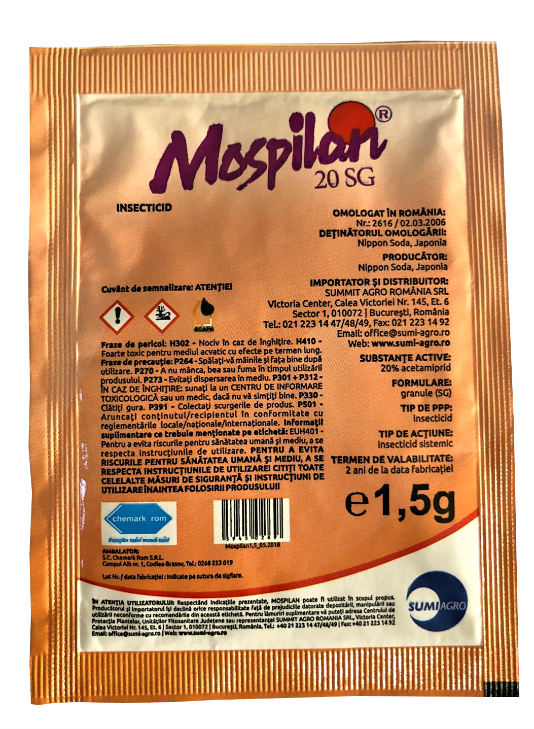 Mospilan 20 SG – este un insecticid de ultima generație cu acțiune sistemica și translaminara ce combate un spectru larg de insecte daunatoare din culturile agricole. Prezinta o acțiune rapidă asupra tuturor stadiilor de dezvoltare a insectelor (ouă, larve, adulti).Mospilan 20SG se prezinta sub forma de granule omogene, fără tendinta de sfaramare, de culoare albastră. Substanta activa: acetamiprid 20%.