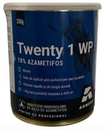 TWENTY 1 WP este o pudra hidrosolubilape baza de 10% azametifos, avand ca atractant Z 9 TRICOSENE. Produsul se aplica ca un strat - pelicula prin pensulare sau pulverizare, avand o actiune rapida si de lunga durata 6-8 saptamani.